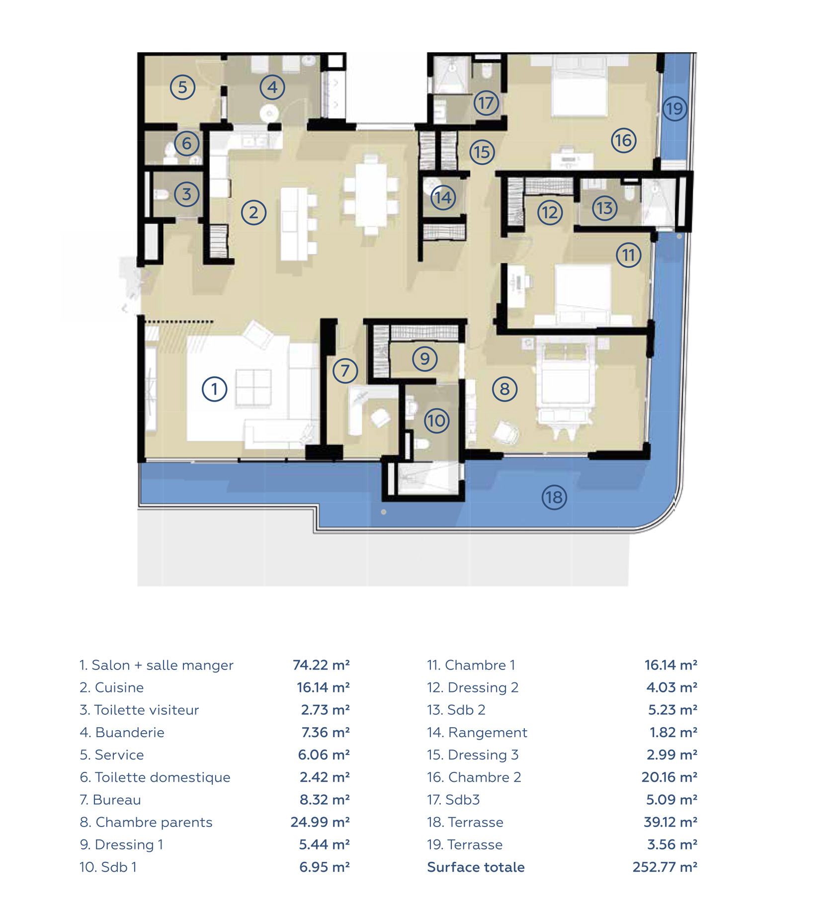 Deux chambres supplémentaires : Chacune comprend un placard, une salle de bains attenante et un balcon, créant ainsi une atmosphère d'intimité et de confort.